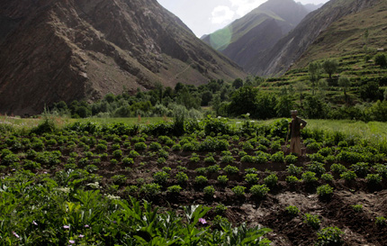 Islam Beg takes a break from working in a potato field in Sarab. Beg sold all his land and livestock to buy opium. He now works the potato field, owned by another village resident, taking home half of what he harvests to feed his family