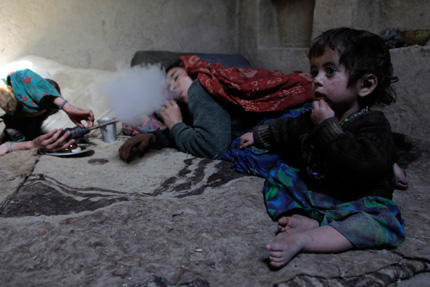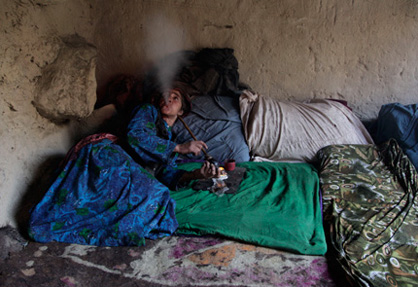 Sarab village resident Jan Begum pauses between hits while smoking opium in her home. “I’ve been smoking opium for 18 years,” said Begun who sent her 14-year-old son out to work for the drug dealers to help pay for the narcotic