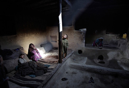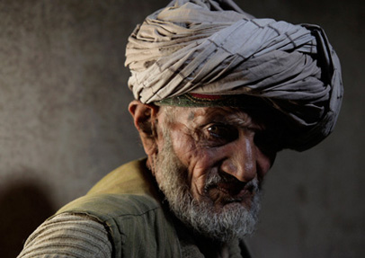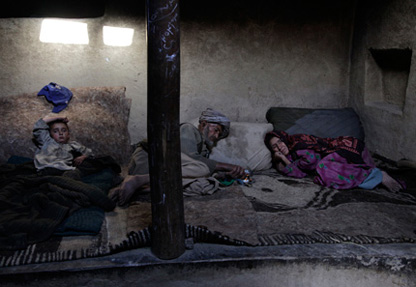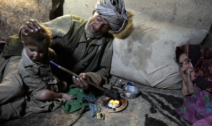 Sarab village resident and opium addict Islam Beg, center, offers his opium pipe to his grandson after having an early morning smoke in July 2009