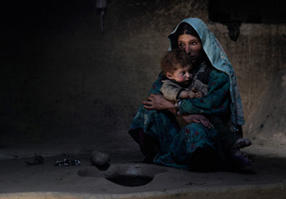 Sarab village resident Raihan comforts her 1-year-old son. Raihan was addicted to opium while pregnant with her son who was an addict at birth. “When he was born, he would cry day and night. But when she blows smoke in his face, he sleeps,” said her father Islam Beg