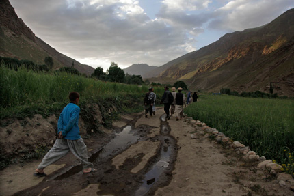 Sarab village residents walk down a dirt path from one section of the village to the next in July 2009. Travel on rough roads to faraway clinics and doctors is difficult. “Opium is our doctor,” say resident addicts who use the narcotic to alleviate symptoms of illness