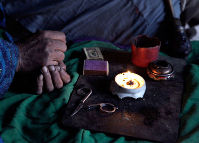Sarab village resident and opium addict Jan Begum smokes opium. “This helps with my asthma,” said Begum who has no money or transportation to travel to a doctor or clinic