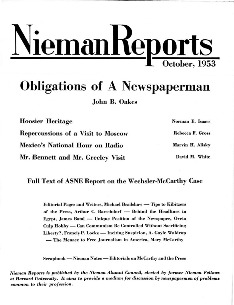 ISSUE Fall 1953 Obligations of a Newspaperman Download PDF Articles Issue Fall 1953: Obligations of a Newspaperman List of Articles October 5, 1953 Masthead Editor Louis M. Lyons
