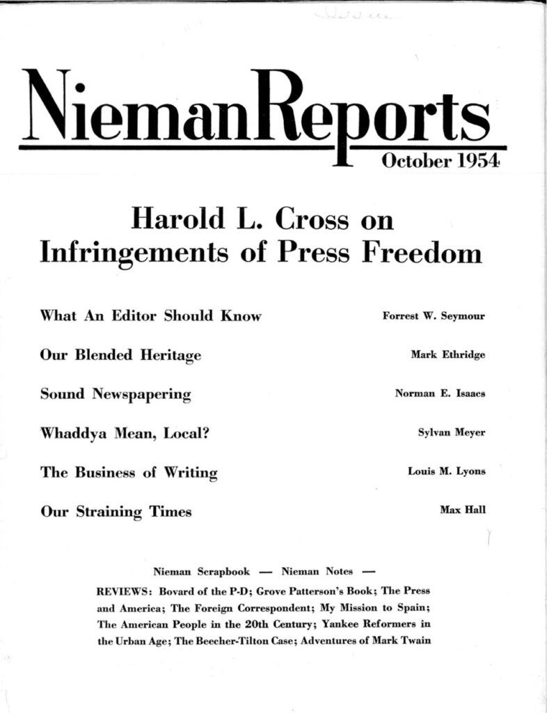 ISSUE Fall 1954 Harold L. Cross on Infringements of Press Freedom Download PDF Articles Issue Fall 1954: Harold L. Cross on Infringements of Press Freedom List of Articles October 1, 1954 Masthead Editor Louis M. Lyons