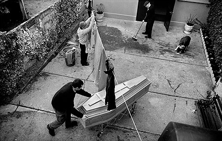 Michael and Matthew O’Halloran, who run a family undertakers in Corofin, County Clare, prepare for a funeral in June 2002 while Matthew’s wife, Eileen, hangs out the washing. Photo by Kenneth O’Halloran/Freelance