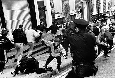 A Royal Ulster Constabulary officer shoots his pistol in the air to save an ambushed colleague during a disturbance in Derry in 1998. Photo by Martin MucCullough/Freelance