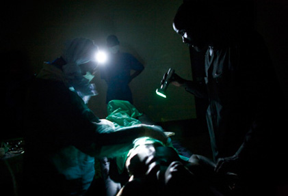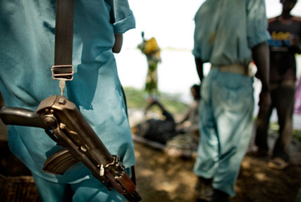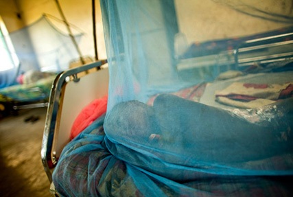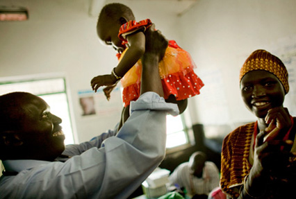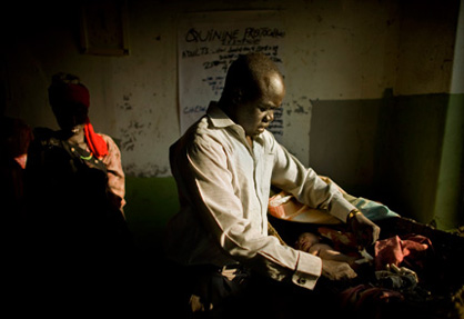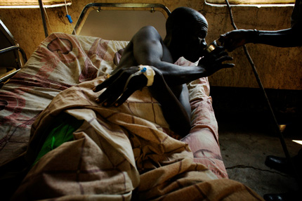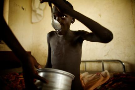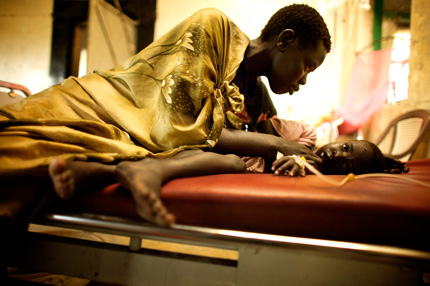 Gatluak Yien, 7, fighting a sever case of malaria and rheumatic fever, is encouraged by his father Simon to eat. Gatluak had been at Akobo Hospital in Akobo, Sudan, for nearly three weeks. Doctors said that if not for the hospital he would have died at home