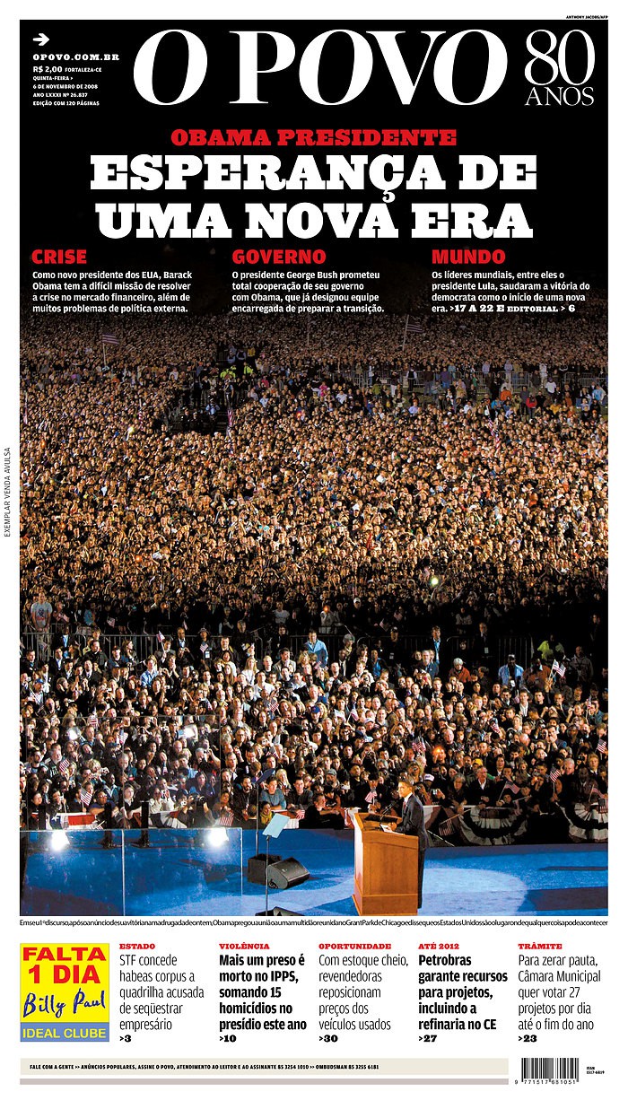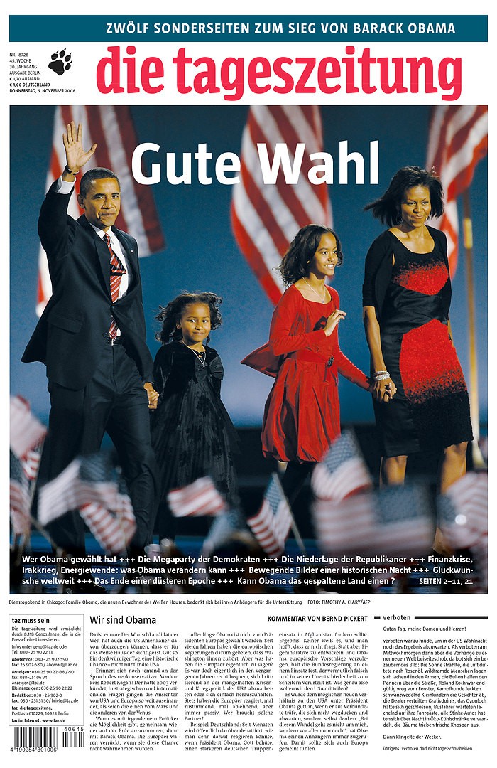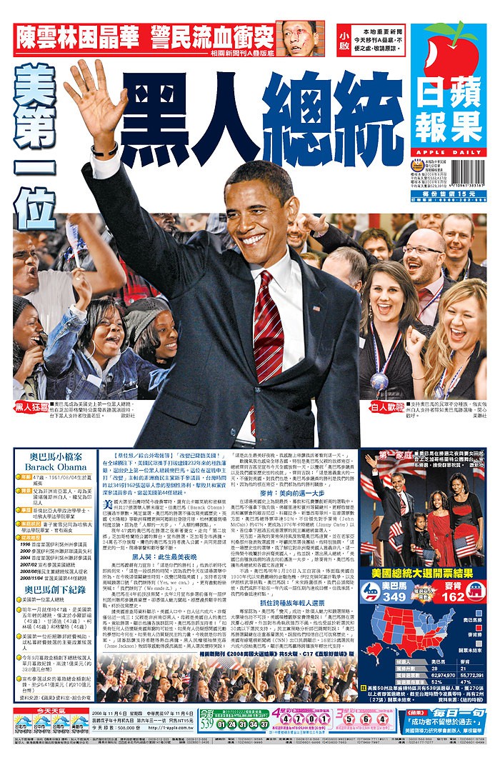 Barack Obama’s 2008 U.S. presidential win, as reported in, from left, O Povo (Fortaleza, Brazil), Apple Daily (Taipei, Taiwan), Maariv (Tel Aviv, Israel), and Die Tageszeitung (Berlin, Germany). All images courtesy the Newseum.