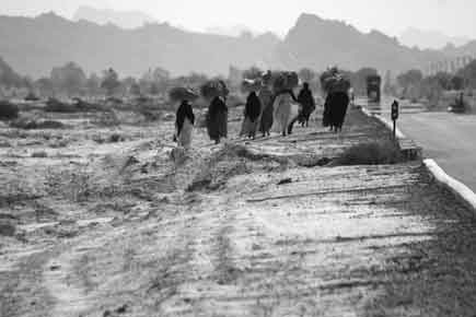 Traditional women in Hormozgan Province walk along the Bandar Abbas-Jask route in the baking midday heat. Their peasant dresses contrast anachronistically against the heavy lorries transporting cut-price Chinese goods on the international highway west