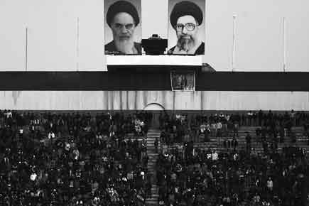 Giant placards of the former and current supreme leaders of the Islamic Republic tower over the 100,000 seat Azadi Stadium in western Tehran during a soccer game. January 2006