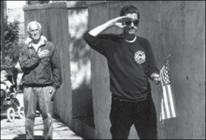 It’s now about five p.m., I’m in Manhattan, and it’s getting dark. Manhattan was like a ghost town; there were no cars on the road. I drive toward the World Trade Center, and I get to a point where I can’t go any further and start to see television satellite trucks and lights about 15 blocks from Ground Zero. And nobody can go beyond this point. So I put my cameras under my dark coat and try to walk past some policeman. I get about 10 yards past and somebody says, “Hey, stop. What are you doing?” He brings me back to the barrier. I start to think about how I am going to get to where I need to be. I don’t feel like because I’m in New York City, with American laws, that my sense of purpose in needing to document what has happened is going to change any more than if I was in Ceaucescu’s Romania trying to show what oppression looks like there. It looks dark to my left, so I started kind of going around streets, heading east. I get to a place where ambulances and fire trucks and rescue workers and police cars are going. I start to walk that way, and I don’t want to blow it because, as I say to myself, “I’m getting real close. This is not the time to get thrown out of here.” At one corner where there were a lot of policemen, I hid underneath an awning and just watched what was going on for about a half an hour. I didn’t see a single cameraman or photographer or journalist. But I did see two people wearing fire and police jackets with cameras so I asked them whether there were any photographers at the site. “Not a soul at this point. Everyone’s been thrown out. There’s not a single photographer there.”