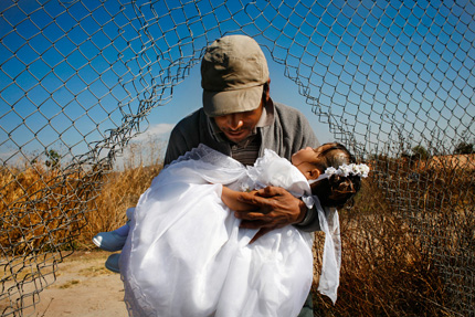 Migration within Mexico has perhaps had a larger impact on numbers of Mexicans than the better publicized story of immigration to the U.S. Just as America rapidly became urbanized in the early 20th century, Mexicans are moving from rural regions to large Mexican cities at increasing rates. Though much of what the cities have to offer—electricity, running water and education—are good, families often discover that moving can be difficult and dangerous, especially for children. Antonio Hernandez carries his daughter Angela to her baptism ceremony through a broken fence on land outside of Guadalajara where they have been living rent free in partial exchange for making bricks. The family moved from the neighboring state of Zacatecas