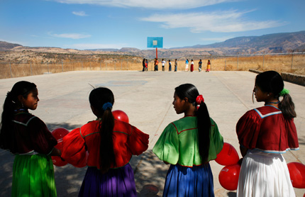 Teenage girls wait for a recess game to start in the indigenous Huichol village, Tuxpan de Bolanos, in the rural part of the state of Jalisco, home of Mexico’s second largest city, Guadalajara. Many of the village’s residents, especially males, have left the villages for big cities, or have entered the Mexican military