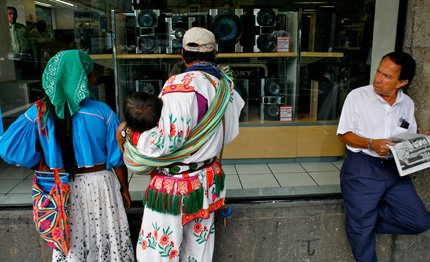Wearing their traditional handmade clothing, Don Juan Lopez, his wife Maria and their youngest daughter Paola, 1, receive a cold stare from a stranger while on a visit to Guadalajara from their indigenous village. Their daughter suffers from hydrocephalus, a dangerous swelling of the head. They regularly bring her to the city for checkups with a doctor