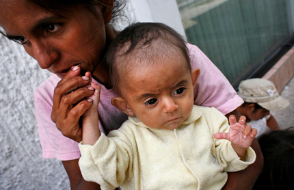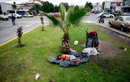 Estrella Suarez, 3, naps in the median of Federalismo, one of the busiest six-lane highways through the city of Guadalajara, Mexico. Her parents wash car windshields for 12 hours a day while she plays in the median and her younger brother, 1, sis all day in his stroller