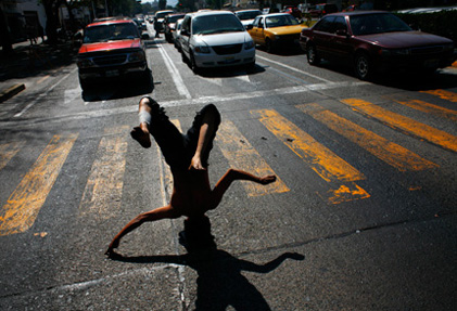 Humberto Juan, an indigenous Mixteco from the southern state of Oaxaca performs headstands at red traffic lights to earn a hundred pesos per day. It is barely enough to cover his rent while in the city for a few months with a little left over to bring home to his family who are all out of work