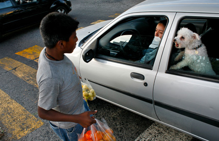 Jesus Raul Gonzales, 12, an indigenous Purepecha from the state of Michoacan, sells fruit on the streets of one of Guadalajara’s richest neighborhoods, Providencia. Working 12 hours a day at a time, he, his parents and siblings make enough money to bring some home with them to their village every three to four months