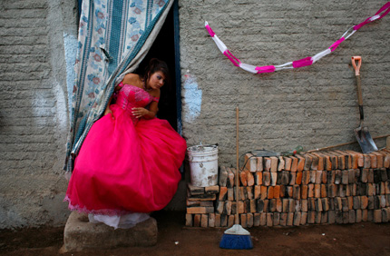 Juana Martinez comes out of her family’s home in her Quinceanera dress, ready for a night of partying, a rarity in a community of brick makers who work seven days a week. The celebration is a tradition in Mexican families to welcome a girl into adulthood