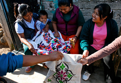 Indigenous Otomí women gather at their twice-monthly meeting of Mnini, an artisan cooperative that they formed in 2008 to sell their hand-stitched bags and tablecloths of traditional design. The 18 women in the cooperative came to Guadalajara in the past decade from their homes in the state of Querétaro where they were unabl to find work. Most are street vendors, selling potato chips, unable to afford the city license that protects them from high fines and harassment from the authorities. The women sell their bags in the U.S. and Canada through fair trade organizations. They hope to expand that business so they can give up being street vendors